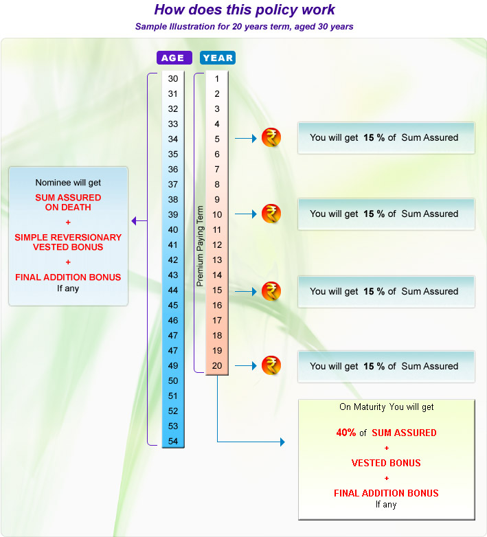 Survival Benefits: In case of Life Assured surviving to the end of the specified durations 15% of the Basic Sum Assured at the end of each of 5th, 10th, 15th & 20th policy year.
